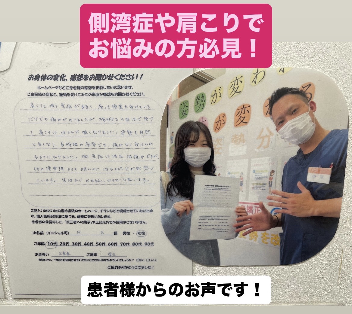 側湾症があることで体の筋バランスが崩れ肩こりにつながっていた。